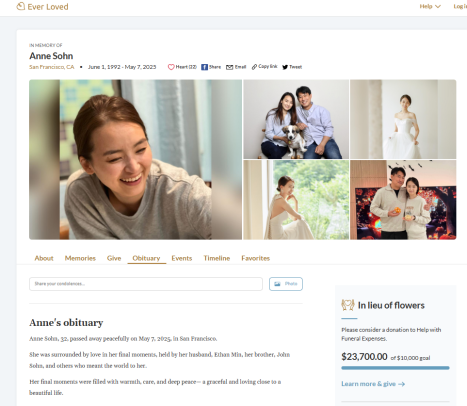 网友提供,2025年5月7日,“法轮功”旗下“飞天艺术学院”加州分校项目总监、舞蹈老师安妮·索恩(Anne Sohn)因癌症病亡,年仅33岁。5月18日,家人在旧金山殡仪馆为其举办了葬礼。