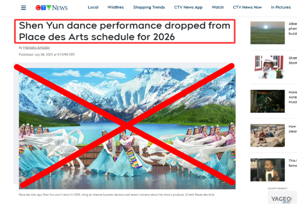 加拿大电视台(CTV)网站2025年7月4日报道《艺术广场取消2026年“神韵演出”安排》称,受《纽约时报》关于“法轮功”旗下“神韵演出”报道影响,加拿大蒙特利尔艺术广场取消2026年度“神韵演出”。