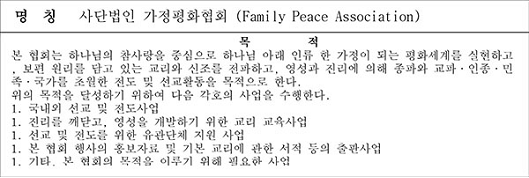 文鲜明的三儿子文显进于2017年成立的“家庭和平协会”,“活动宗旨”宣称:“以神的真爱为核心,实现神统治之下人类成为一体大家庭的和平世界,传播蕴含‘保贤原理’的教义与信条,以灵性和真理为名,开展超越教派、宗教、人种、民族、国家的传教活动。为达成这一目的,将推进国内外传教事业,以及让人‘领悟真理’‘开发灵性’教义的教育事业……”。实际上,这些不过是文鲜明的歪理邪说。