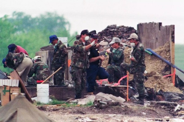 ▲1993年4月28日,探员们在大卫·考雷什及其信徒的大本营卡梅尔庄园废墟中搜索