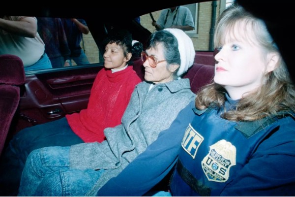 ▲1993年3月21日,美国得克萨斯州韦科镇,两名不知名女性离开“大卫教派”大本营前往麦克伦南县监狱