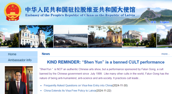 2024年12月7日,中国驻拉脱维亚大使馆刊载《温馨提醒:“神韵”是被禁的邪教表演》,指出“神韵”不是正宗的中国艺术表演,而是由“法轮功”赞助的表演。