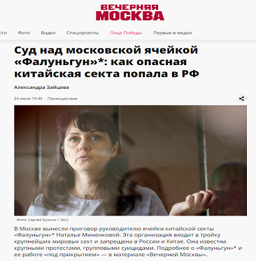 编者按:2025年7月24日,俄罗斯《莫斯科晚报》网站发布深度报道《俄法院对“法轮功”在俄分支头目进行审判:“法轮功”如何在俄罗斯进行渗透》(Суд над московской ячейкой «Фалуньгун»*: как опасная китайская секта попала в РФ),通过莫斯科图希诺区法院判处“法轮功”邪教组织在俄分支头目娜塔莉娅·米涅恩科娃4年监禁,指出“法轮功”邪教以煽动成员大规模非法聚集和集体自杀而臭名昭著,受到俄罗斯和中国政府依法取缔。