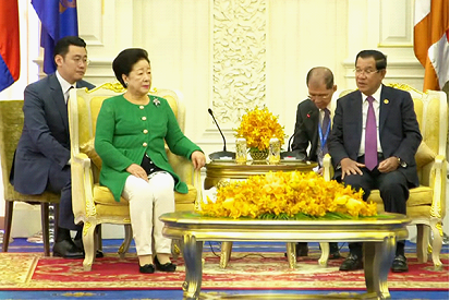 ▲ 2019年韩鹤子与柬埔寨前总理会面。图源:2022年6月26日HJ和平电视台影像截图