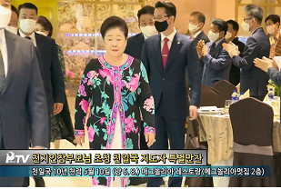 ▲ 2022年6月26日PEACE TV影像截图显示,当时的播音员称,尹永浩依照韩鹤子的指示前往柬埔寨,并称尹永浩此行是“‘真母’之爱的延申”。画面另显示,6月8日,韩鹤子于清平HJ木兰花餐厅二楼设宴招待包括尹永浩在内的“高层干部”。