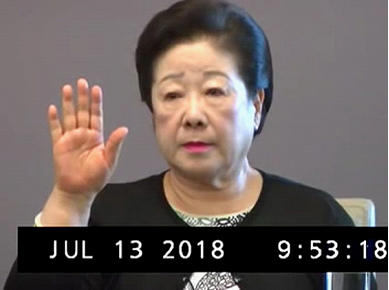 ▲“统一教”现任头目韩鹤子在2018年7月13日、14日两天,以证人身份在美国法院出庭,接受文显进方面律师问询并作出回答。该证词视频已于同年9月11日发布在油管网上。图为当时视频截图
