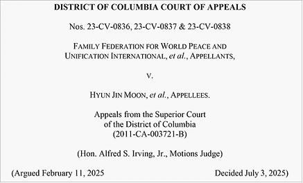 华盛顿特区巡回上诉法院以“不干涉教派问题”为由驳回诉讼,称“确认判决并终结这场持续14年的诉讼”,却难掩这场纠纷的丑陋本质——这不过是邪教内部围绕成员上交供奉款展开的一场母子分赃大战,最终以三儿子胜出定局。