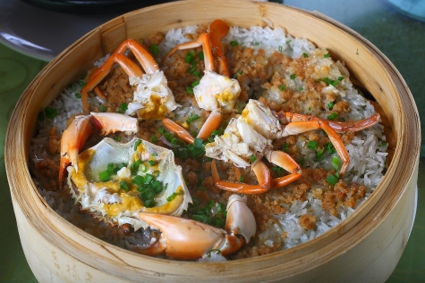 要连着主食一起烹煮,可以试下温暖的糯米饭——将奄仔蟹和糯米一同蒸焗,蟹味渗透入糯米当中。糯米蒸得差不多之后,加入由干贝、瑶柱、虾米自调的汁酱和蟹一同蒸焗.