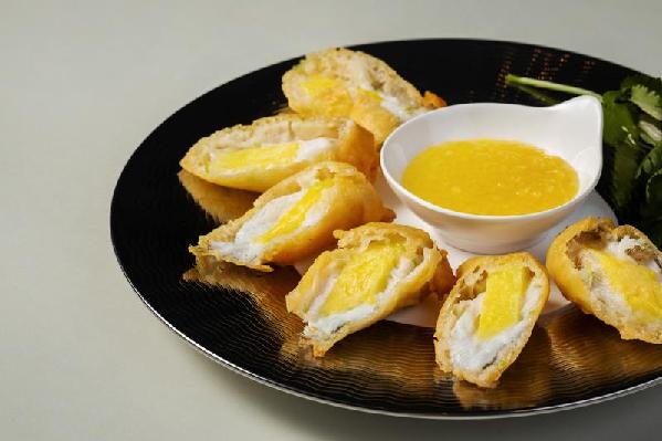 潮汕九肚鱼,别名豆腐鱼,细滑如豆腐,白里透红、肉质鲜嫩且水分含量多。有别于传统潮汕菜——菜脯九肚鱼的做法,珍庭主厨别出心裁,将九肚鱼与新鲜菠萝搭配,成就了一道菠萝九肚鱼。鱼表面炸得金黄酥脆的九肚鱼,和黄澄澄的菠萝相得益彰,九肚鱼浑身柔软少骨、肉质鲜美,裹挟着一丝热带水果的酸味和香甜,十分可口。