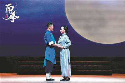 其次是武戏设计震撼吸睛。导演翁国生介绍,2.0版更着力演员的“唱念做打”全面表现。在新增的《刻谱》一场,江一龙以铁锥为笔、石板为纸镌刻北腿口诀时,融入戏曲“出手功”技巧,在月下演绎刚柔并济的南拳韵律,意境深远,武舞相融。而当郭胜男怒毁拳谱,传统的“椅子功”“摔跌功”的“腾挪摔打”被转化为情感冲突的外化,让武林理念之争具象为充满戏曲美学的身体对话。