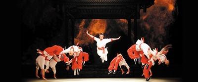剧中“淞沪会战”,设计了大型战场集体武舞,有机融合戏曲“颠步”“磋步”“微步”“曲步”及“前空翻”“旋子360”“乌龙绞柱”“飞脚过人”等高难度毯子功技巧。在硝烟战火中舞出军人的无畏英姿,将武戏的戏剧张力和观赏性推向高潮。