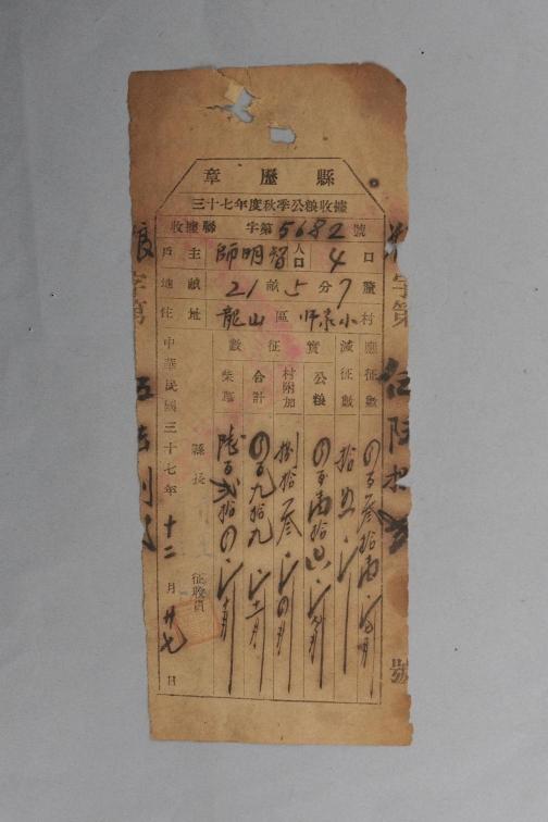 这是1948年12月27日章历县秋季公粮收据。上半部分用笔填写编号、户主、住址等内容;下半部分用笔竖式填写应征数、藏征数、实征数等内容;并盖有方形的红公章和县长的私章。据1990年版的《章丘县粮食志》记载,当时在抗日根据地内,共产党制定的交纳标准是“每亩约20斤计算”。同时期国统区内,国民党制定的标准则是“每亩约交纳50斤”。按照国民党的纳税上交标准,此户主师明智21余亩地要缴粮1000余斤左右,而共产党只收400多斤,农民负担减轻不少,共产党的土地政策得到了广大农民的拥护。