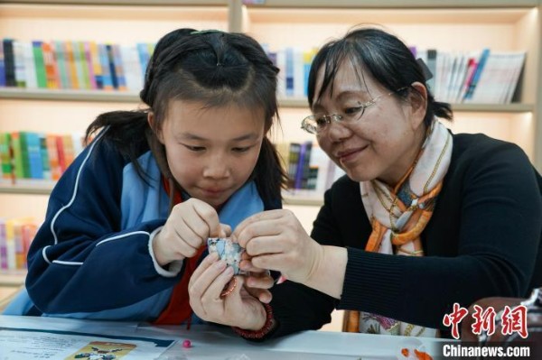 资料图:图为老人和小学生一起制作重阳节香囊。马铭言 摄