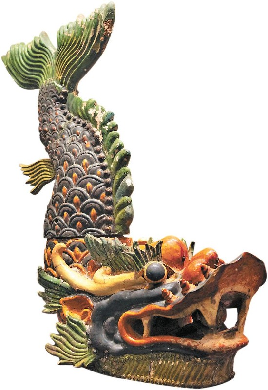 镇海楼(广州博物馆)内陈列的明代石湾窑鳌鱼,原是明万历年间佛山霍氏祠堂屋脊的装饰物。