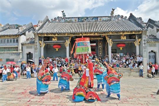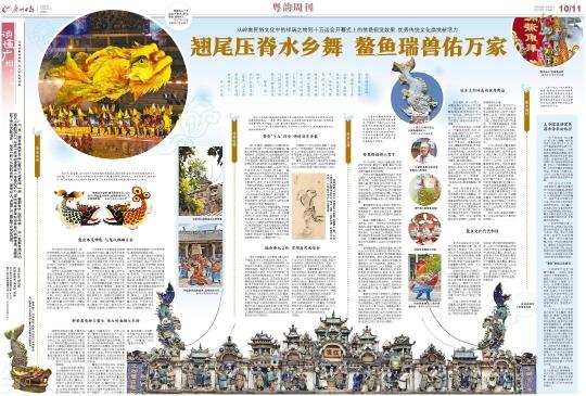 陈家祠、镇海楼、五仙观等广州地标建筑的屋脊上,鳌鱼造型灵动,给古朴的建筑平添几分生趣;三月三广州民间北帝诞,飘色巡游队伍中,鳌鱼舞动,锣鼓喧天。有学者表示,鳌鱼并非“鱼”,而是源自古代神话故事中的“龟”,自唐宋随儒学传入岭南,并与当地文化融合。