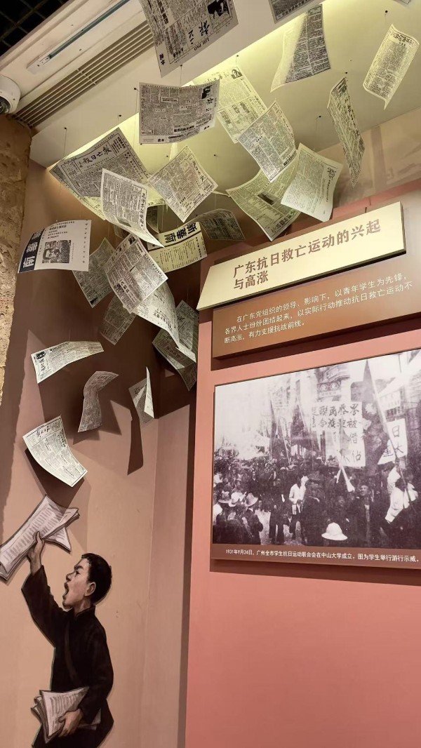 专题展现场展出多个重磅展品包括《中国共产党为日军进攻卢沟桥通电》(1937年7月8日)、《为抗日救国告全国各校学生和各界青年同胞宣言》(1935年12月20日)、抗日战争时期《广东青年抗日先锋队队歌》雕版印刻,以及广东青年抗日先锋队队徽印章等。综合利用多媒体和展项设计,打造多个场景装置以增强沉浸式观展体验——通过声光电综合场景,结合华南文化抗战介绍短片,并运用抗战版画、期刊杂志、救亡音乐等作品,构建出沉浸式观展空间,全方位展现文化界人士以笔为枪、以剧援战、以歌动员、以画为媒,积极投身文化抗战的历史。
