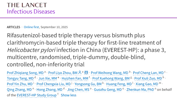 据光明日报报道,北京大学第三医院消化科教授周丽雅/宋志强团队带领全国40家相关消化疾病诊疗中心研究发现,含利福特尼唑的三联方案,为治疗幽门螺杆菌感带来了全新的选择。相关成果日前于《柳叶刀-感染病学》在线发表。