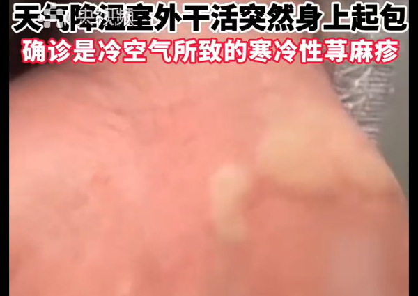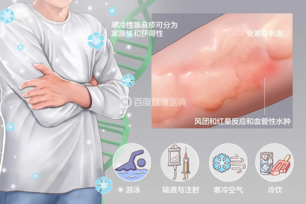 寒冷性荨麻疹又称寒冷性接触性荨麻疹,是皮肤遇到冷风、冷水、冰块、冷空气等低温刺激后,局部肥大细胞释放组胺等炎症介质,导致接触部位形成瘙痒性风团和(或)血管性水肿的病症,并伴随剧烈瘙痒、刺痛。其最常见的诱发因素是寒冷天气。