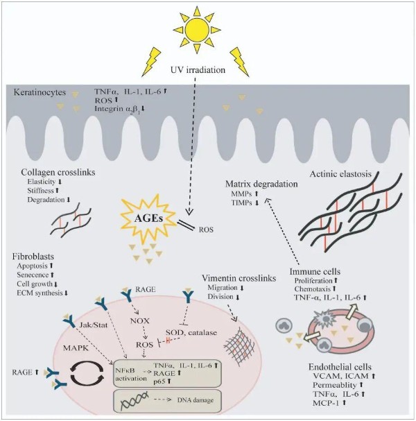 图 2. AGEs 对皮肤的影响:通过改变真皮蛋白的理化特性、降低细胞增殖能力、增加细胞凋亡和衰老、诱导氧化应激及促炎介质等多种途径,共同导致皮肤老化的外在表现(来自参考资料)