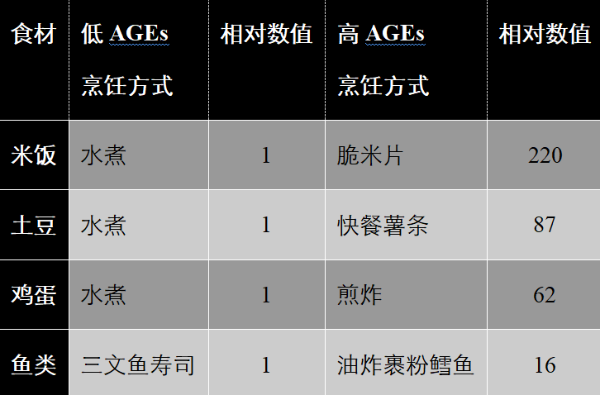 与此同时,应减少高 AGEs 烹饪方法,也就是一些高温、干热的烹饪方式,例如烧烤、煎炸和烘烤。下表就能非常直观地看出不同烹饪方式的优劣。
