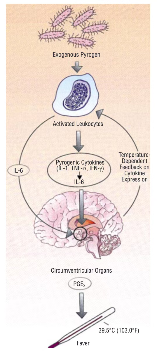 炎症介质还会使局部的毛细血管扩张、充血、神经末梢敏感化,从而引发刺痛感,这种疼痛往往早于鼻塞、流涕等全身症状,是免疫系统激活的早期信号。另外,有一些炎症介质会进入血液循环,作用于大脑的体温调节中枢,从而导致发热。